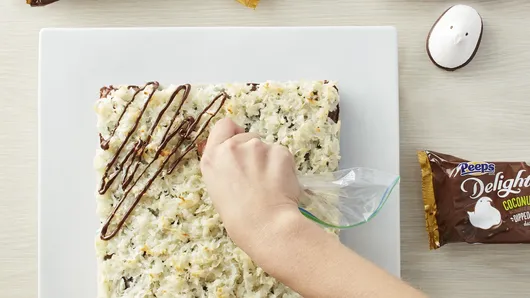 Step3In small microwavable bowl, microwave chocolate chips and 1/4 teaspoon oil uncovered on High 30 to 60 seconds, stirring halfway through, until chips can be stirred smooth. Spoon into resealable food-storage plastic bag; seal bag. Cut small tip from corner of bag; drizzle chocolate over coconut mixture. Top with chicks; let stand about 30 minutes or until chocolate drizzle is set. To serve, cut into 4 rows by 3 rows.