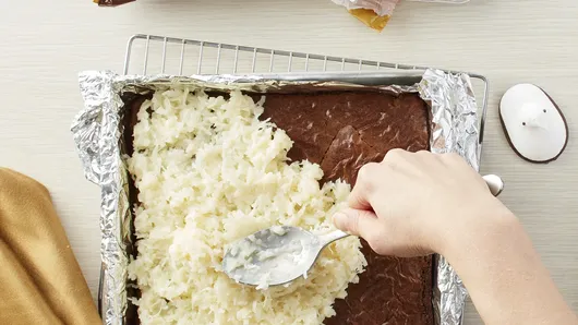 Step2Meanwhile, in medium bowl, mix coconut, sweetened condensed milk and almond extract. Remove brownies from oven, and carefully spoon and spread coconut mixture evenly over brownies. Bake 14 to 17 minutes longer or until coconut is lightly browned. Cool completely, about 2 hours; remove from pan by lifting sides of foil.