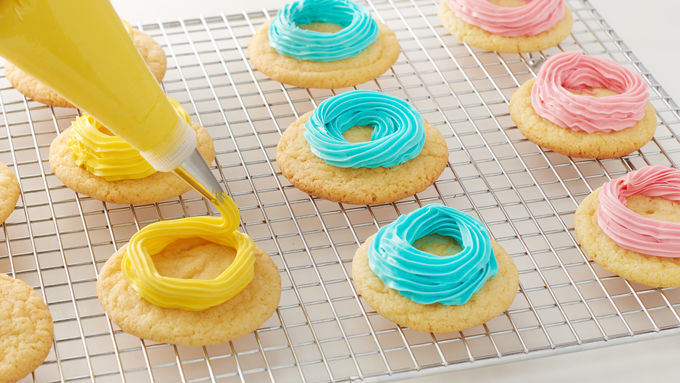These bright and cheerful springtime treats have a special surprise waiting for anyone who loves a sweet and tender sugar cookie! Each cookie is frosted with a brightly colored frosting "nest" with a PEEPS® chick nestled on top. But under each chick, there's even more colorful fun: a clutch of sweet jelly bean "eggs"! Make this playful cookie for your favorite spring gathering—they're sure to be the star of the show. MORE+ LESS-