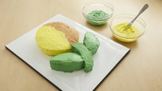Step5Spread remaining yellow frosting on circle. Spread remaining green frosting to cover leaves and stem.