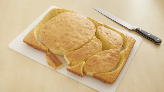Step2Use serrated knife to cut 8-inch circle from cake; cut 2 leaves and stem from remaining cake. (See link below for diagram and template.)