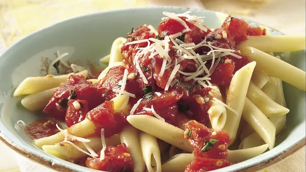 Step3Just before serving, toss pasta, tomatoes and remaining vinaigrette. Serve with cheese.