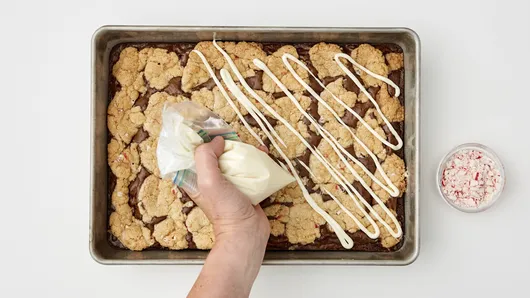 Step2Make cookie dough as directed on pouch for drop cookies. Stir in 1/4 cup of the crushed candies. Drop dough by spoonfuls over top of brownie batter.