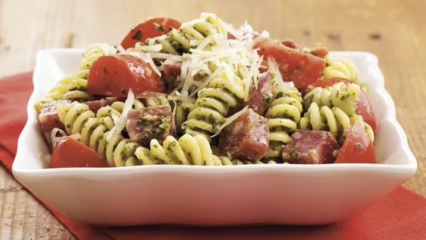 Step2Toss vegetables and pesto. Sprinkle with cheese.