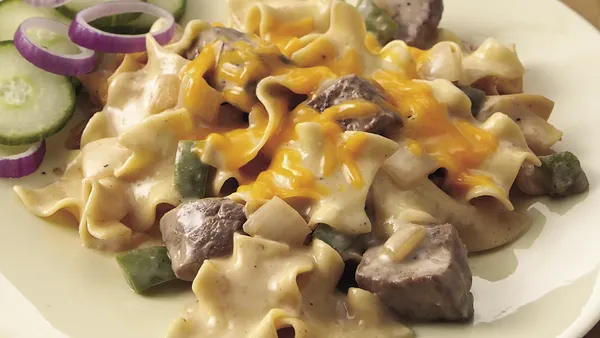 Step2In 10-inch skillet, cook beef over medium-high heat 5 to 7 minutes, stirring occasionally, until brown; drain. Stir in cheese dip. Cook 2 to 3 minutes or until hot.