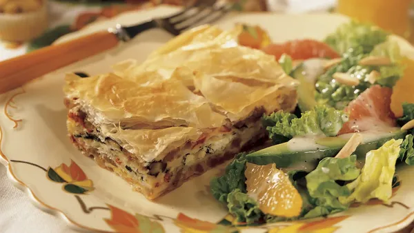 A lovely layered egg casserole features flaky phyllo, hearty sausage and colorful vegetables.