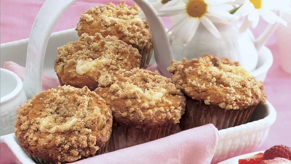 Step3Stir together flours, cinnamon, baking powder, baking soda and salt in medium bowl. Mix egg, egg white, 3/4 cup brown sugar, the oil and vanilla in large bowl, using fork or wire whisk. Stir in crushed pineapple. Stir in flour mixture, carrot and raisins, using spoon, just until moistened. Divide batter evenly among muffin cups.
