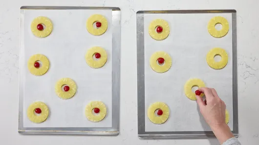 Drain the canned pineapple rings on a paper towel-lined tray. Transfer seven rings to each of two parchment paper-lined cookie sheets, spacing evenly to allow at least 2 inches between rings. Place a cherry on the center of each ring.