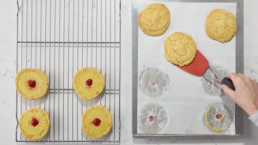 Cooling these pineapple upside-down cookies slightly before transferring them to a cooling rack helps to ensure they don’t fall apart in the process. When cookies cool, they become firmer, or less fragile, and because these cookies need to be flipped over, to expose the fruit on the bottom side of the cookie, it’s even more important to cool them. If you attempt to move the cookies while they are too warm, they are likely to fall apart in the process of transferring them to the cooling rack.