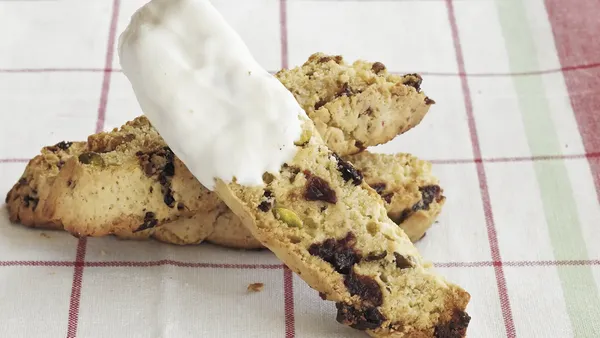 That's Italian! Baked twice for a crunchy texture, biscotti are mildly sweet cookies meant to be dunked in coffee.