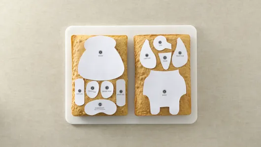 Step5Remove cakes from freezer. Place templates over cakes as shown in photo. (See link below for diagram and templates.) Cut cakes around templates. (Discard cake scraps or save for another use.) Cut about one-third of height off forehead piece and ears. Cut nose piece into pyramid shape following lines of triangle.