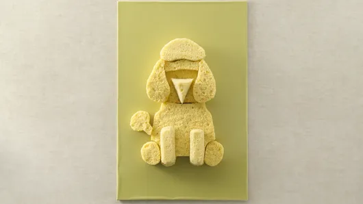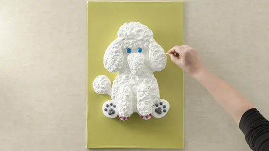 Step8Frost entire cake with remaining white frosting as shown in photo. Use extra frosting to round edges of muzzle and legs to blend into body. Mound frosting on head, ears, legs and end of tail to create a more 3-D look. With end of toothpick, use small swirling motions to create curly fur appearance.
