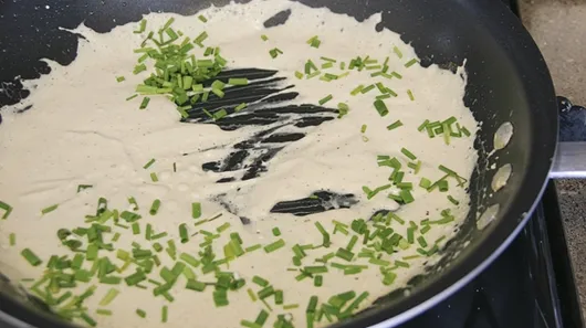 Step2Add broth and cream cheese to warm skillet. Cook about 5 minutes, stirring frequently with whisk, until cheese is melted and sauce is smooth. Stir in 3 tablespoons of the chives.