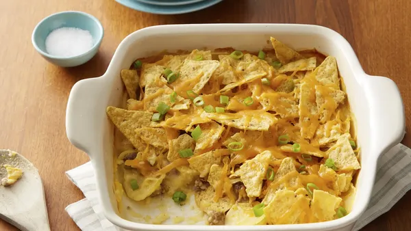 Step4Bake uncovered about 30 minutes or until top is light golden brown. Sprinkle chips over casserole; sprinkle remaining cheese over chips. Bake 3 to 5 minutes longer or until cheese is melted. Let stand 2 minutes before serving.