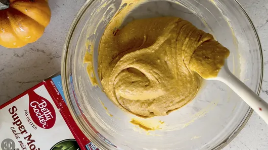 Step2In a medium bowl, beat eggs with whisk until fluffy and light yellow, about 2 minutes of vigorous whisking. Add pumpkin, cake mix, 1 1/2 teaspoons cinnamon, and nutmeg; whisk until just combined. Pour batter into pan, spreading evenly to the edges.