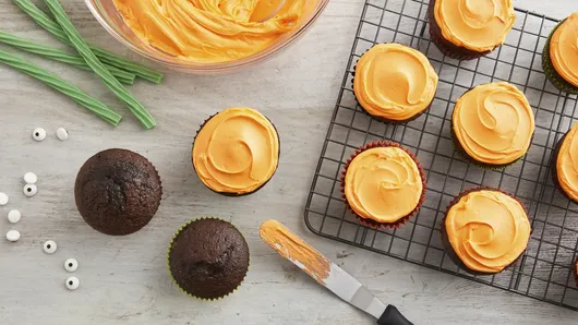 Step3In small bowl, place vanilla frosting; tint with orange food color to desired color. Frost each cupcake with 1 generous tablespoon orange frosting.