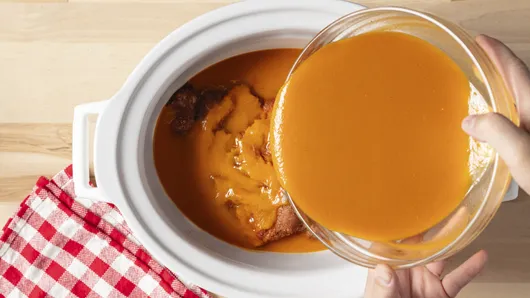 Place the pork butt in a slow cooker and pour the pumpkin and stock mixture over the pork. Cover; cook on high for 6 to 8 hours, until the pork is tender and shreds easily when pierced with a fork.