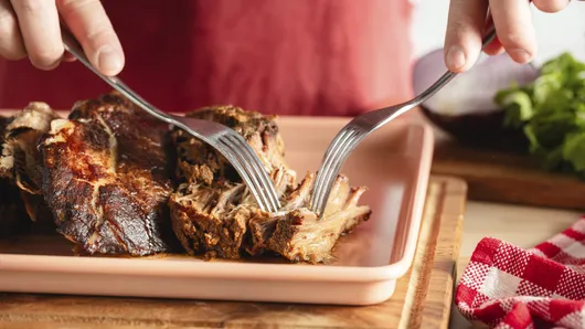 To serve, spoon pork onto tortillas, garnish with red onions, cilantro, and salsa. Leftover pork will keep in an airtight container in the refrigerator for up to 5 days.