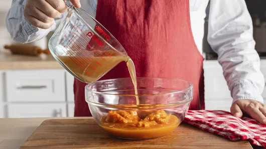 In a large bowl, whisk together the pumpkin puree and beef stock.