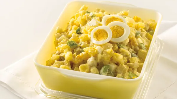 Step2In large bowl, stir together mayonnaise and mustard. Add potatoes and remaining ingredients; toss until coated. Cover and refrigerate at least 1 hour until chilled.