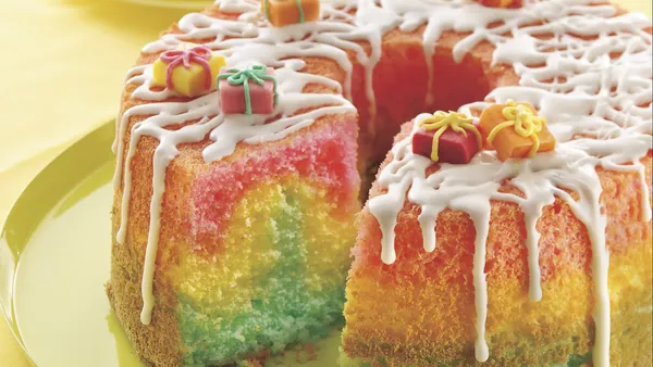 Step2Divide batter evenly among 3 bowls. Gently stir 6 to 8 drops of one food color into each of the batters. Pour red batter into ungreased 10-inch angel food (tube) cake pan. (Do not use fluted tube cake pan or 9-inch angel food pan or batter will overflow.) Spoon yellow batter over red batter. Spoon green batter over top.