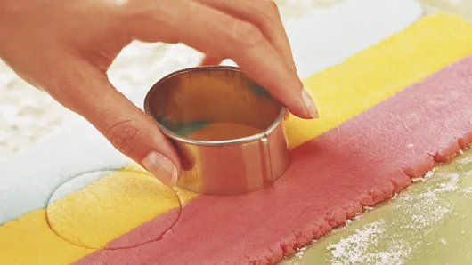 Step2Shape 1/3 cup of each color of dough into a rope about 5 inches long and 1 inch in diameter. Place ropes side by side and a little more than 1/4 inch apart on floured surface; roll until 1/4 inch thick. Cut with 2- to 2 1/2-inch egg-shaped cookie cutter so each cookie has 3 colors. Sprinkle with sugar. Place 2 inches apart on ungreased cookie sheet. Repeat with remaining dough. (When rerolling dough scraps, carefully lay matching colors together.)