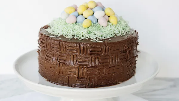 Decorate the cake with sprinkles. Place coconut in a resealable food-storage plastic bag; add a few drops of green food color. Seal bag and shake the bag until coconut is evenly tinted. Sprinkle coconut on serving plate around and in the center of the cake for “Easter grass.”