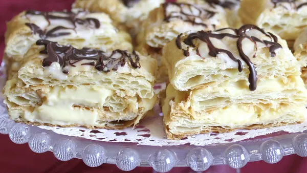 Crisp puff pastry squares are filled with a sweet, cream mixture flavored with fresh raspberries and almond extract.