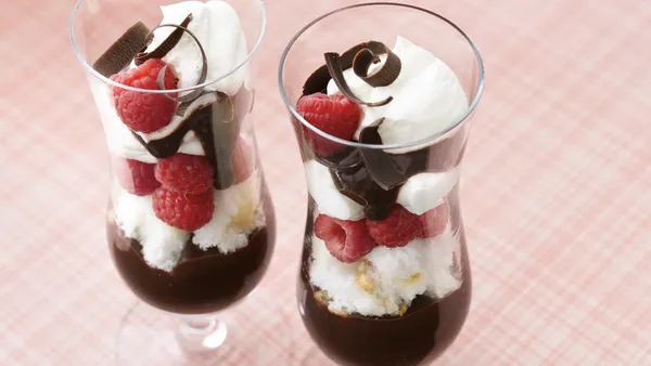 Step1Divide half of the whipped topping among 4 dessert dishes. Layer each with 1 tablespoon of the syrup and 1/4 cup of the raspberries.
