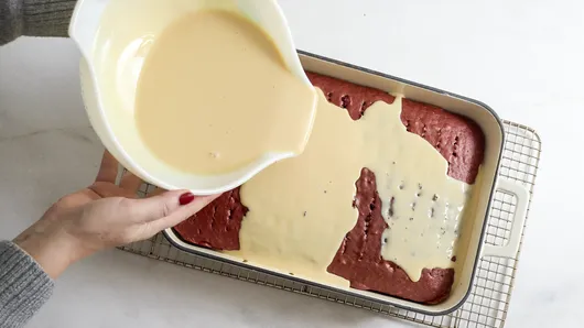 In a medium bowl, mix Tres Leches ingredients until blended. Carefully pour the mixture evenly over the top of the cake, allowing the mixture to soak into the holes. Refrigerate 2 hours until the cake is chilled.