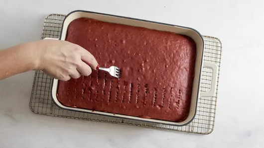 Using a fork, poke holes every 1/2 inch over the top of the cake. If necessary, wipe the fork tines occasionally with a paper towel to reduce sticking.