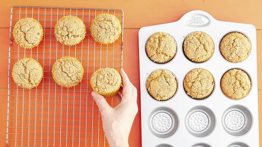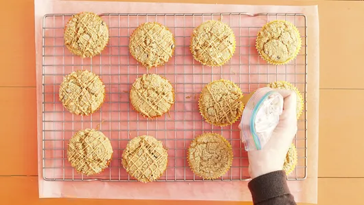 Step4Place cooling rack with muffins over cookie sheet or waxed paper. In small microwavable bowl, place peanut butter. Microwave uncovered on High 15 to 20 seconds or until peanut butter is warmed and thin enough to drizzle. Drizzle peanut butter over tops of muffins.