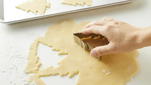 On floured surface, roll dough 1/4 inch thick. Cut with 3-inch tree-shaped cookie cutter; place cutouts 2 inches apart on ungreased cookie sheets.