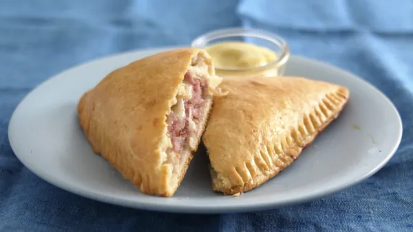 Step2For each sandwich, place one-fourth of dough on surface sprinkled with Bisquick mix; roll in Bisquick mix to coat. Press dough into 6 1/2-inch round, 1/4 inch thick. Arrange 1/4 of the corned beef on dough to within 1/2 inch of edges, folding beef to fit if necessary. Top with 2 tablespoons of sauerkraut mixture and 1/4 cup cheese. Fold sandwich in half; press edges with tines of fork to seal. Place on ungreased cookie sheet.