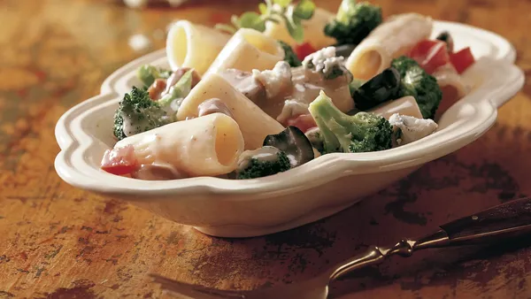 Step1Mix all ingredients except rigatoni and cheese. Cover and refrigerate at least 2 hours but no longer than 24 hours.