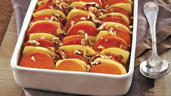 Step2Spray 13x9-inch (3-quart) glass baking dish with cooking spray. In medium bowl, toss apples and lemon juice. In baking dish, arrange potatoes and apples in alternating layers. Pour lemon juice from bowl over potatoes and apples.