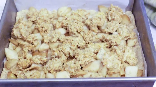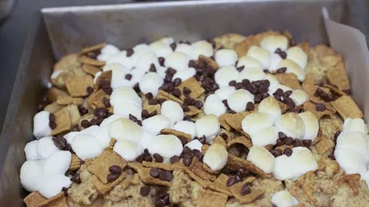 Step6Remove Base from oven. Spoon cooked apples in caramel over Base. Sprinkle 1 teaspoon salt over apples. Top with S’more Toppings. Crumble reserved cup of dough evenly over top.