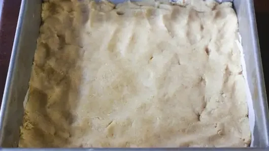 Step4Reserve 1 cup of dough for topping. Press remaining dough in bottom of pan to form Base. Bake 15 minutes.
