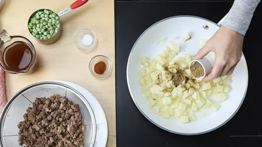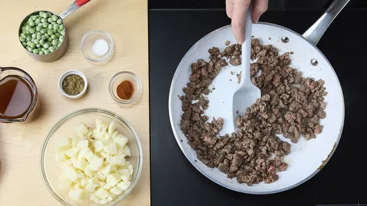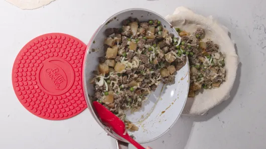 var configuration = {"title":"Samosa Pot Pie","introduction":"\u003cp\u003eDiscover the fusion recipe of your dreams with our samosa pot pie. It merges the flaky goodness of homemade pie crust and spicy, flavorful samosa filling for a hearty and delicious dinner you’ll want to make again and again.\u003c/p\u003e\u003cp\u003eWhen you think of delightful street food, Indian samosas are likely one of the first things that come to mind. However, this iconic fried snack, with its crispy exterior and flavorful filling, wasn’t born in India, but in the Middle East. The story of the samosa begins in medieval Persia, where it was a sweet treat, often filled with nuts and sugar. The South Asian samosa we know today was introduced to the Indian subcontinent by Central Asian and Middle Eastern chefs during the 13th and 14th centuries. Their savory versions often included meat and nuts.\u003c/p\u003e\u003cp\u003eOur creative take on this classic dish combines the comfort of a basic pot pie with the aromatic spices of traditional samosas. We add a little melty cheese to pull it all together. Using simple ingredients like ground beef, shredded mozzarella cheese, and frozen peas, this innovative samosa pot pie recipe will be a hit at your dinner table, guaranteed to impress your family and friends.\u0026nbsp;\u003c/p\u003e","servingSize":"1 Slice","image":{"small":{"media":"(min-width: 0px)","src":"https://mojo.generalmills.com/api/public/content/jm52YYkUTwOUFQ2D4wDrCg_webp_base.webp?v=7b176b60\u0026t=e724eca7b3c24a8aaa6e089ed9e611fd"},"medium":{"media":"(min-width: 500px)","src":"https://mojo.generalmills.com/api/public/content/jm52YYkUTwOUFQ2D4wDrCg_webp_base.webp?v=7b176b60\u0026t=191ddcab8d1c415fa10fa00a14351227"},"large":{"media":"(min-width: 767px)","src":"https://mojo.generalmills.com/api/public/content/jm52YYkUTwOUFQ2D4wDrCg_webp_base.webp?v=7b176b60\u0026t=191ddcab8d1c415fa10fa00a14351227"},"alt":"Samosa Pot Pie"},"contributor":{"label":"By","name":"Betty Crocker Kitchens","profileUrl":"/about-us","displayDate":{"label":"Updated","date":"May 8, 2025"}},"ingredientGroups":[{"name":"Pie Crust","ingredients":[{"quantity":"2","description":"cups Gold Medal™ All Purpose Flour"},{"quantity":"1/2","description":"teaspoon salt"},{"quantity":"2/3","description":"cup cold butter, diced"},{"quantity":"6","description":"to 10 tablespoons ice-cold water"}]},{"name":"Filling","ingredients":[{"quantity":"1","description":"lb ground beef (at least 80% lean)"},{"quantity":"2","description":"tablespoons vegetable oil"},{"quantity":"2","description":"cups refrigerated diced potatoes and onions (from 20-oz bag)"},{"quantity":"1","description":"tablespoon garam masala"},{"quantity":"1/2","description":"teaspoon salt"},{"quantity":"1/2","description":"teaspoon ground red pepper (cayenne)"},{"quantity":"1","description":"cup Progresso™ Classic Beef Broth (from 32-oz carton)"},{"quantity":"1","description":"cup frozen sweet peas"},{"quantity":"8","description":"oz shredded mozzarella cheese (2 cups)"}]}],"steps":[{"description":"Place flour and 1/2 teaspoon salt in bowl of food processor fitted with metal blade attachment. Add butter; pulse until particles are size of small peas. Drizzle in cold water, 2 tablespoons at a time, pulsing until all flour is moistened and pastry almost leaves side of bowl.","stepShotImageUrl":"//mojo.generalmills.com/api/public/content/AHhbzOPqRqaHq5OaljS0Ew_webp_base.webp?v=cee6beb5\u0026t=51a43a57af4046789e5a7f20567b1195"},{"description":"Gather pastry into two even balls. Shape into flattened rounds on lightly floured surface. Wrap flattened rounds of pastry in plastic wrap; refrigerate about 45 minutes or until dough is firm and cold, yet pliable. This allows the butter to become slightly firm, which helps make the baked pastry more flaky. If refrigerated longer, let pastry soften slightly before rolling.","stepShotImageUrl":"//mojo.generalmills.com/api/public/content/fstojxpBQqGOpYgRjTHWgw_webp_base.webp?v=8edad91a\u0026t=51a43a57af4046789e5a7f20567b1195"},{"description":"Meanwhile, heat oven to 450°F. In 12-inch nonstick skillet, cook beef over medium-high heat 5 to 7 minutes, stirring occasionally, until thoroughly cooked; drain and keep warm. Wipe out skillet.","stepShotImageUrl":"//mojo.generalmills.com/api/public/content/FfIWYP97Ro6MD6FG8pXoIA_webp_base.webp?v=94f9aec9\u0026t=51a43a57af4046789e5a7f20567b1195"},{"description":"In same skillet, heat oil over medium heat. Add potato mixture, garam masala, 1/2 teaspoon salt, and the ground red pepper. Cover and cook 12 to 14 minutes, stirring occasionally, until tender and beginning to brown. ","stepShotImageUrl":"//mojo.generalmills.com/api/public/content/0EyuahEPR12cXeLfDQbGFQ_webp_base.webp?v=6198b78d\u0026t=51a43a57af4046789e5a7f20567b1195"},{"description":"Stir in beef, broth, and frozen peas; heat just to a boil, stirring occasionally. Remove from heat. Cover and keep warm.","stepShotImageUrl":"//mojo.generalmills.com/api/public/content/g7XDne0jSyWJTsBROkSA9Q_webp_base.webp?v=6426c0e0\u0026t=51a43a57af4046789e5a7f20567b1195"},{"description":"Roll pastry on lightly floured surface, using floured rolling pin, into circles 2 inches larger than upside-down 9-inch glass pie plate. Fold one pastry into fourths; place in pie plate. Unfold and ease into plate, pressing firmly against bottom and side. Trim overhanging edge of pastry 1 inch from rim of pie plate. ","stepShotImageUrl":"//mojo.generalmills.com/api/public/content/DWZFN4QxRiipBW1M9oJKRw_webp_base.webp?v=2f26f83c\u0026t=51a43a57af4046789e5a7f20567b1195"},{"description":"Stir cheese into beef mixture; add to pastry-lined pie plate. Top with second pastry round; trim as needed. Fold edges of top pastry over edges of bottom pastry and pinch to seal; flute as desired. Make several slits to vent.","stepShotImageUrl":"//mojo.generalmills.com/api/public/content/1VxROJmGRtWVzFn_g3DRWA_webp_base.webp?v=6ffc347c\u0026t=51a43a57af4046789e5a7f20567b1195"},{"description":"Bake 15