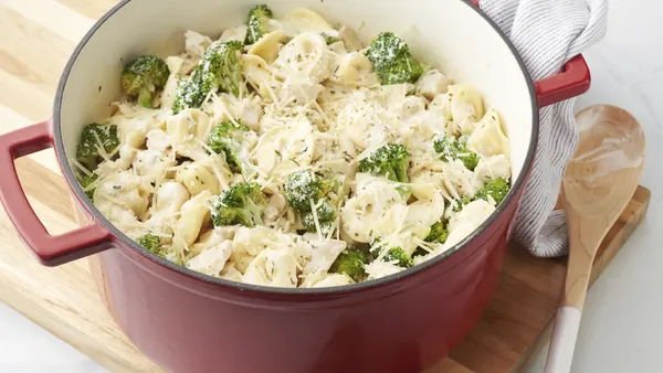 A zesty cheese sauce coats tender pockets of tortellini, crisp-tender veggies and flavorful chicken.
