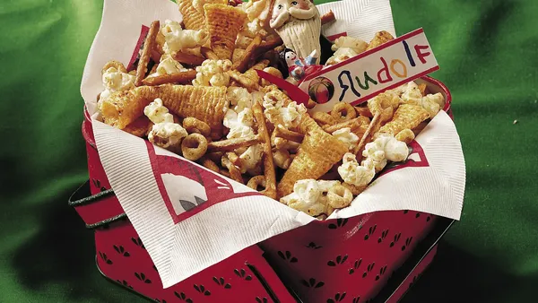 Step1Heat oven to 300°. Mix popcorn, pretzels and crackers in ungreased rectangular pan, 13x9x2 inches. Mix remaining ingredients; drizzle over popcorn mixture. Toss until evenly coated.