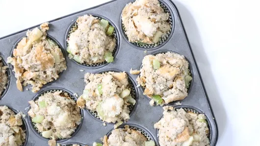 Step5Line a cupcake tray with paper liners. Divide the stuffing into each cup. Pack the stuffing and round the tops with your palms. Bake until the top is nicely golden, 30 to 35 minutes. Let cool for 10 minutes before removing from the pan.