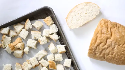 Step1Preheat the oven to 350° F. Cut the bread into 1-inch cubes. Spread the bread cubes on two baking trays lined with parchment paper. Place on two trays in the oven and bake for 10 minutes.