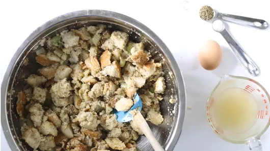 Step4In a large bowl, place the bread, apple and celery mixture, eggs, chicken or vegetable broth, sage, thyme, salt and pepper. Mix well.