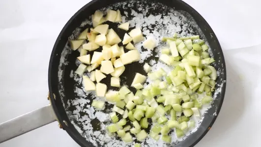 Step3Meanwhile, melt the butter in a skillet over medium heat. Add the apples (if using) and celery and cook until they start to soften, about 5 minutes. Remove from heat and let cool about 10 minutes.