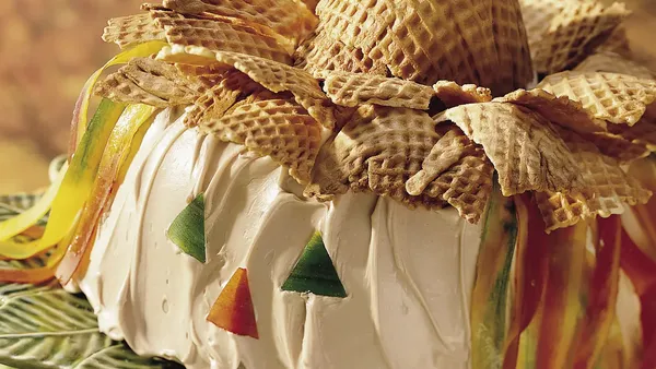 Step3Place cake on serving plate. Stir together frosting and syrup; reserve 1/4 cup of the frosting. Spread remaining frosting over cake. For straw hat, place 1 waffle bowl upside down in center of cake. Stack 5 more bowls on first bowl.