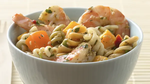 Step3Drain pasta; rinse with cold water. Shake to drain well. Stir pasta into salad mixture. Sprinkle with sesame seeds. Serve immediately, or cover and refrigerate until serving.