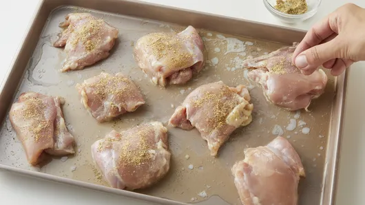 Heat oven to 425°F. Spray large rimmed sheet pan with cooking spray. Pour melted butter in pan, and tip pan side to side to spread evenly. In small bowl, mix salt, pepper, garlic powder and ginger. Rub salt mixture on chicken thighs, and place in pan. Roast 15 minutes; turn.