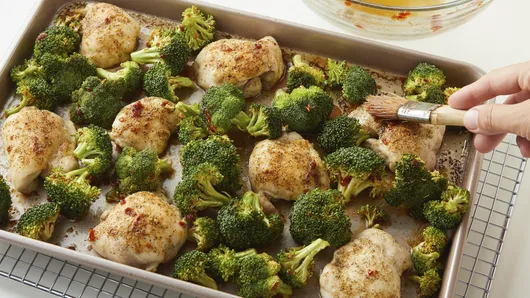 var configuration = {"title":"Sheet-Pan General Tso\u0027s Chicken","introduction":"With this easy sheet-pan recipe, you get all the flavor of General Tso\u0027s chicken, just without the frying, the breading, or the splattering all over your stove! Sweet, slightly spicy and umami-rich, this Chinese-restaurant classic is just as good (or perhaps, even better) when made at home. Serve it up on a bed of rice, and you won\u0027t miss the take-out version one bit!","servingSize":"About 1 1/2 Thighs and 1/2 Cup Broccoli","image":{"small":{"media":"(min-width: 0px)","src":"https://mojo.generalmills.com/api/public/content/UluSEOafu02NUb_1-pB3Og_webp_base.webp?v=9bed7b86\u0026t=e724eca7b3c24a8aaa6e089ed9e611fd"},"medium":{"media":"(min-width: 500px)","src":"https://mojo.generalmills.com/api/public/content/UluSEOafu02NUb_1-pB3Og_webp_base.webp?v=9bed7b86\u0026t=191ddcab8d1c415fa10fa00a14351227"},"large":{"media":"(min-width: 767px)","src":"https://mojo.generalmills.com/api/public/content/UluSEOafu02NUb_1-pB3Og_webp_base.webp?v=9bed7b86\u0026t=191ddcab8d1c415fa10fa00a14351227"},"alt":"Sheet-Pan General Tso\u0027s Chicken"},"contributor":{"label":"By","name":"Betty Crocker Kitchens","profileUrl":"/about-us","displayDate":{"label":"Updated","date":"Sep 9, 2019"}},"ingredientGroups":[{"ingredients":[{"quantity":"3 ","description":"tablespoons butter, melted "},{"quantity":"1/4 ","description":"teaspoon salt "},{"quantity":"1/4 ","description":"teaspoon pepper "},{"quantity":"1/4 ","description":"teaspoon garlic powder "},{"quantity":"1/4 ","description":"teaspoon ground ginger "},{"quantity":"1 ","description":"package (20 oz) boneless skinless chicken thighs "},{"quantity":"2 ","description":"tablespoons soy sauce "},{"quantity":"1 ","description":"tablespoon packed brown sugar "},{"quantity":"1 ","description":"tablespoon natural rice vinegar "},{"quantity":"1 ","description":"tablespoon chili garlic sauce "},{"quantity":"1 ","description":"tablespoon sesame oil "},{"quantity":"4 ","description":"cups broccoli florets "},{"quantity":"1/4 ","description":"cup sliced green onions "},{"quantity":"1 ","description":"teaspoon sesame seed"}]}],"steps":[{"description":"Heat oven to 425°F. Spray large rimmed sheet pan with cooking spray. Pour melted butter in pan, and tip pan side to side to spread evenly. In small bowl, mix salt, pepper, garlic powder and ginger. Rub salt mixture on chicken thighs, and place in pan. Roast 15 minutes; turn. ","stepShotImageUrl":"//mojo.generalmills.com/api/public/content/FO6Cnk9-H0qs6wpx8b2TSA_webp_base.webp?v=21fdca35\u0026t=51a43a57af4046789e5a7f20567b1195"},{"description":"In large bowl, mix soy sauce, brown sugar, vinegar, chili garlic sauce and sesame oil. Add broccoli florets; toss to coat. Using slotted spoon, place florets in single layer around chicken. Brush chicken with remaining soy mixture left in bowl. ","stepShotImageUrl":"//mojo.generalmills.com/api/public/content/Oa6hvfG5akqNuXLK5TieCA_webp_base.webp?v=67afca7a\u0026t=51a43a57af4046789e5a7f20567b1195"},{"description":"Roast 8 to 12 minutes longer or until juice of chicken is clear when thickest part is cut (at least 165°F) and broccoli is tender. Top with green onions and sesame seed. ","stepShotImageUrl":"//mojo.generalmills.com/api/public/content/j_TeUtXOQ06C8U52ka1gfg_webp_base.webp?v=11016065\u0026t=51a43a57af4046789e5a7f20567b1195"}],"tips":[{"title":"","description":"Kitchen Tested: 7/2019","category":"Kitchen Tested","tipShots":[]},{"title":"","description":"Broccoli really soaks up the flavor of any dressing or marinade. For this reason, we recommend only lightly tossing it in the soy mixture and using the remainder to brush on the chicken.","category":"Techniques","tipShots":[]},{"title":"","description":"Boneless skinless chicken thighs are one of our favorite protein choices, because thighs are flavorful and slightly fattier than chicken breasts, which allows them to stay moist and tender longer.","category":"Techniques","tipShots":[]},{"title":"","description":"Can\u0027t take the heat? Reduce the chili garlic sauce to 1 teaspoon.","category":"Variation","tipShots":[]},{"title":"","description":"Although General Tso was indeed a real person, there are some serious questions about whether he ever ate the chicken that carries his name. In fact, the original story of this dish is pretty unclear. What we do know is that this Chinese-restaurant staple probably comes from Hunan Chinese cooking traditions. Hunan cooking is famous for its spicy flavors, vibrant colors and rich aromas, and it\u0027s considered one of the great cuisines of China. General Tso\u0027s chicken, however, is typically more sweet than spicy, probably an adaptation that was made once it landed in this country. It is typically served fried crispy with broccoli and sprinkled with sesame seed. Expect flavors of soy, rice wine vinegar, chiles and garlic. If you love this dish, try our \u003ca href=\u0022https://www.bettycrocker.com/recipes/easy-general-Tso\u0027s-chicken/35b55e6b-9ce3-4bfd-9bea-a9a19f32e689\u0022 target=\u0022_blank\u0022\u003eEasy General Tso\u0027s Chicken recipe\u003c/a\u003e next.","category":"Editorial","tipShots":[]}],"kitchenTips":[{"title":"","description":"Broccoli really soaks up the flavor of any dressing or marinade. For this reason, we recommend only lightly tossing it in the soy mixture and using the remainder to brush on the chicken.","category":"Techniques","tipShots":[]},{"title":"","description":"Boneless skinless chicken thighs are one of our favorite protein choices, because thighs are flavorful and slightly fattier than chicken breasts, which allows them to stay moist and tender longer.","category":"Techniques","tipShots":[]},{"title":"","description":"Can\u0027t take the heat? Reduce the chili garlic sauce to 1 teaspoon.","category":"Variation","tipShots":[]}],"additionalContent":[],"faq":[],"tipCategories":[{"categoryName":"Editorial","heading":"More About This Recipe","cssClass":"recipePart
