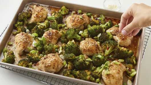 Roast 8 to 12 minutes longer or until juice of chicken is clear when thickest part is cut (at least 165°F) and broccoli is tender. Top with green onions and sesame seed.